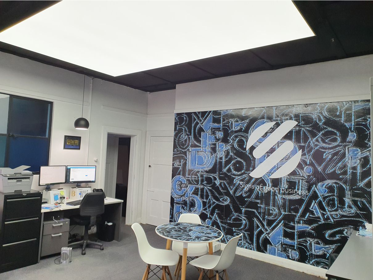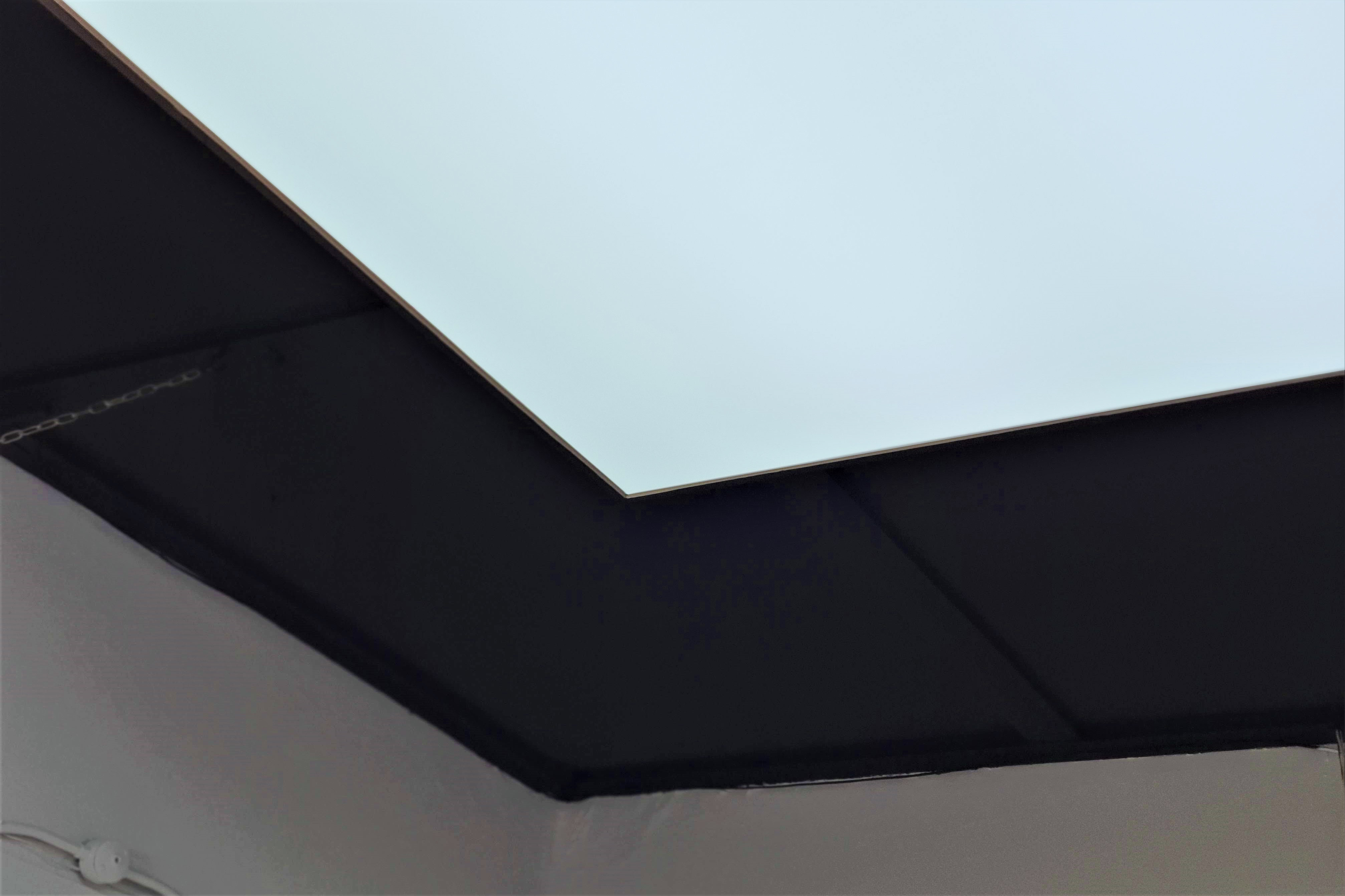 The challenge was to design a ceiling that would liven up the office space at Signcraft. Various design solutions have been considered, and the client has chosen to go for a bespoke lightbox in the centre of the ceiling cavity with a matte black paint all around it, to make it pop. The rest of the interior design is under construction, and we are sure it will compliment the unique contrasting ceiling design, with black and white color palette. The light is illuminated with LED strips, which are installed in the know how technique we have developed in house at Extenzo Design. Power efficient, bright and gorgeously looking ceiling in the office space.